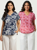 Pack Of 2 Womens Dark Grey And Pink Airy Linen Cotton Printed Tops
