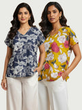 Pack Of 2 Womens Dark Grey And Yellow Airy Linen Cotton Printed Tops