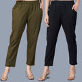 Pack Of 2 Womens Regular Fit Dark Green And Black Fully Elastic Waistband Cotton Trouser