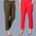 Pack Of 2 Womens Regular Fit Dark Green And Red Fully Elastic Waistband Cotton Trouser