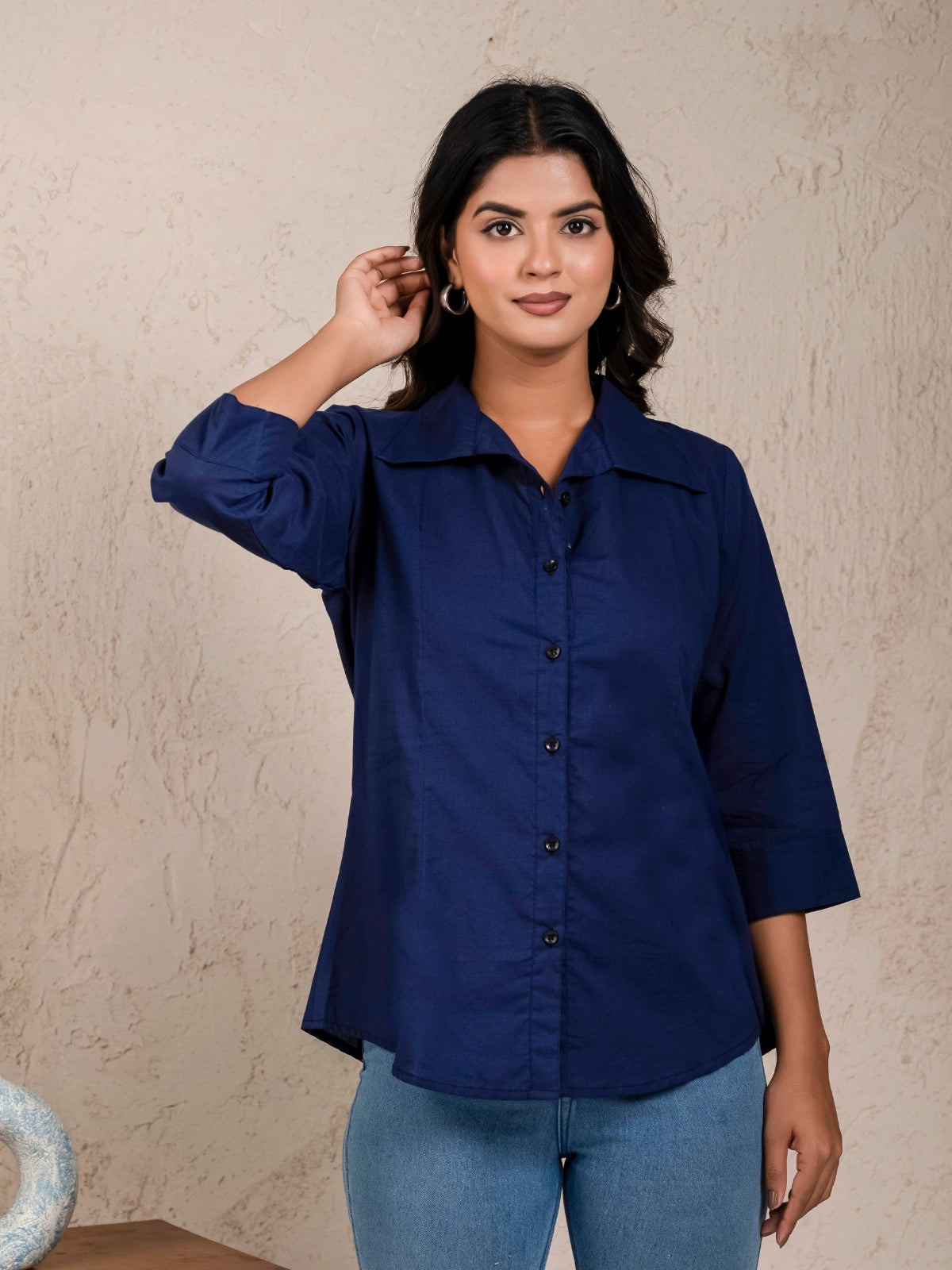 The 3/4 sleeves and fashionable spread collar of this women's solid cambric cotton shirt provide the ideal balance of comfort and style. The shirt is lightweight, breathable, and perfect for semi-formal and informal settings because it is made of premium cambric cotton. In addition to providing a snug fit, the button-down closure provides a timeless touch. This flexible shirt goes well with any ensemble, whether you're dressing up for work or a weekend trip. For a stylish, classic style, wear it with skirts, jeans, or pants. This garment is a wardrobe staple that will add style and functionality.