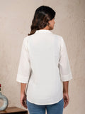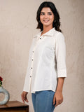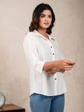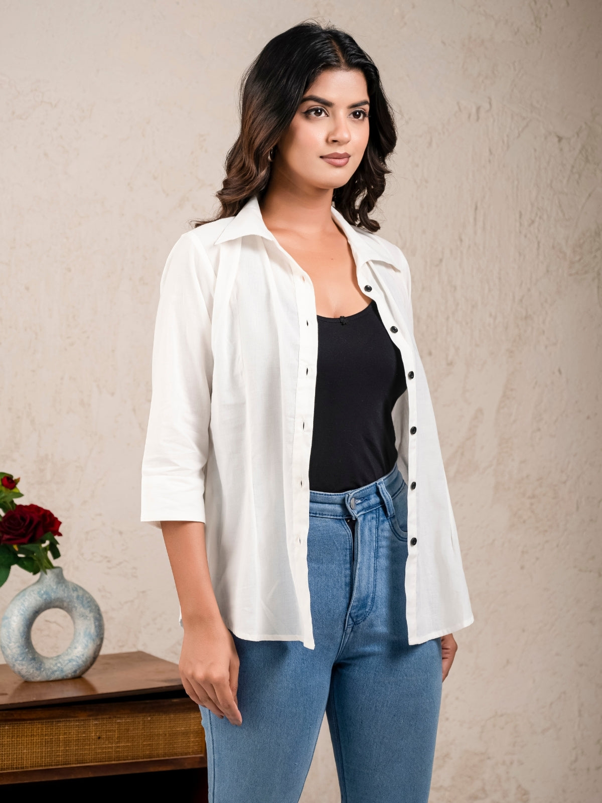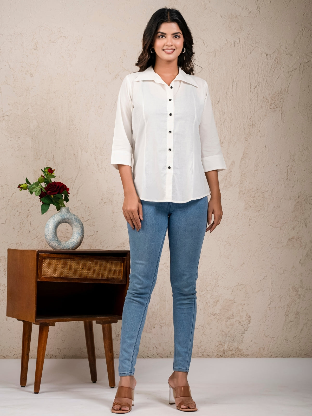 The 3/4 sleeves and fashionable spread collar of this women's solid cambric cotton shirt provide the ideal balance of comfort and style. The shirt is lightweight, breathable, and perfect for semi-formal and informal settings because it is made of premium cambric cotton. In addition to providing a snug fit, the button-down closure provides a timeless touch. This flexible shirt goes well with any ensemble, whether you're dressing up for work or a weekend trip. For a stylish, classic style, wear it with skirts, jeans, or pants. This garment is a wardrobe staple that will add style and functionality.