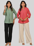 Solid Green And Mauve Pink V Neck Viscose Pleated Tops Combo
