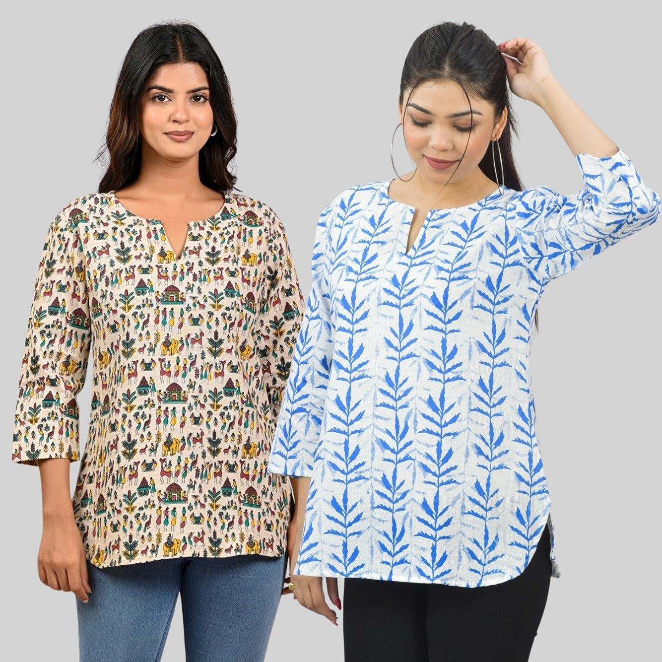 Discover the ideal combination of style and comfort with our Womens Regular Fit Short Kurti/Tops Combo. Embrace the essence of fashion with appealing floral, tribal, vector, and zigzag prints that bring a splash of excitement to your outfit. These tops are made of quality cotton and are breathable and cosy all day. The round neck with a V-cut enhances your neckline, giving you a sleek and modern look. Elevate your fashion quotient easy with these adaptable short kurti tops that move from casual outings to semi formal occasions. Shop now to update your look with the latest fashion trends for women!