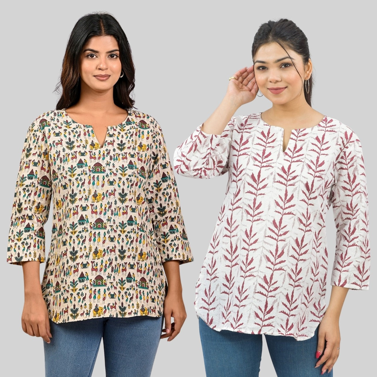 Discover the ideal combination of style and comfort with our Womens Regular Fit Short Kurti/Tops Combo. Embrace the essence of fashion with appealing floral, tribal, vector, and zigzag prints that bring a splash of excitement to your outfit. These tops are made of quality cotton and are breathable and cosy all day. The round neck with a V-cut enhances your neckline, giving you a sleek and modern look. Elevate your fashion quotient easy with these adaptable short kurti tops that move from casual outings to semi formal occasions. Shop now to update your look with the latest fashion trends for women!