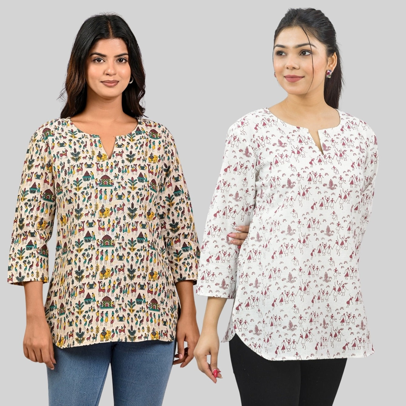 Discover the ideal combination of style and comfort with our Womens Regular Fit Short Kurti/Tops Combo. Embrace the essence of fashion with appealing floral, tribal, vector, and zigzag prints that bring a splash of excitement to your outfit. These tops are made of quality cotton and are breathable and cosy all day. The round neck with a V-cut enhances your neckline, giving you a sleek and modern look. Elevate your fashion quotient easy with these adaptable short kurti tops that move from casual outings to semi formal occasions. Shop now to update your look with the latest fashion trends for women!
