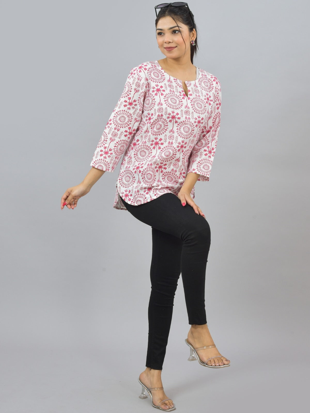 Discover the ideal combination of style and comfort with our Womens Regular Fit Short Kurti/Tops Combo. Embrace the essence of fashion with appealing floral, tribal, vector, and zigzag prints that bring a splash of excitement to your outfit. These tops are made of quality cotton and are breathable and cosy all day. The round neck with a V-cut enhances your neckline, giving you a sleek and modern look. Elevate your fashion quotient easy with these adaptable short kurti tops that move from casual outings to semi formal occasions. Shop now to update your look with the latest fashion trends for women!