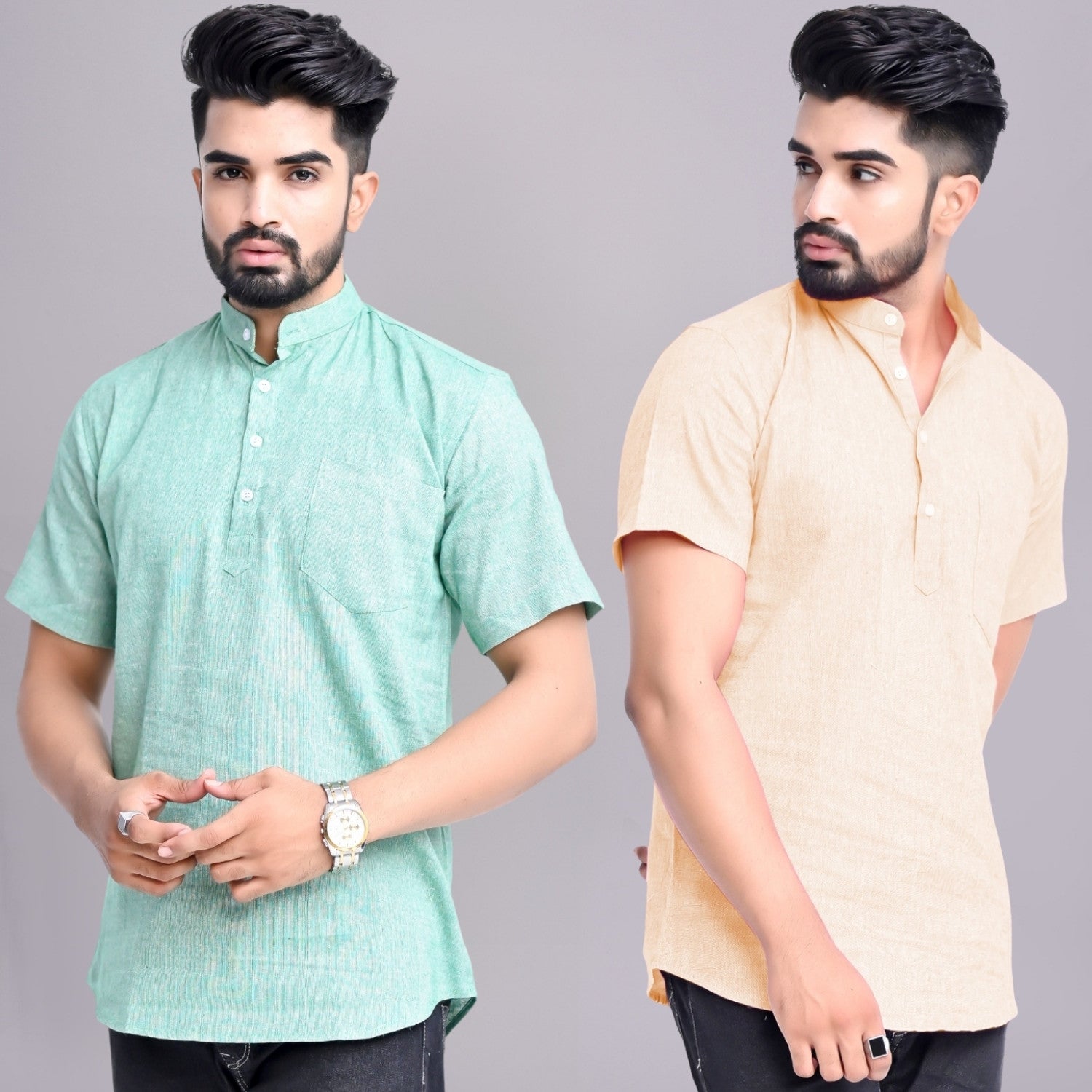 Pack of 2 Mens Solid Green And Off White Khadi Cotton Short Kurta Combo