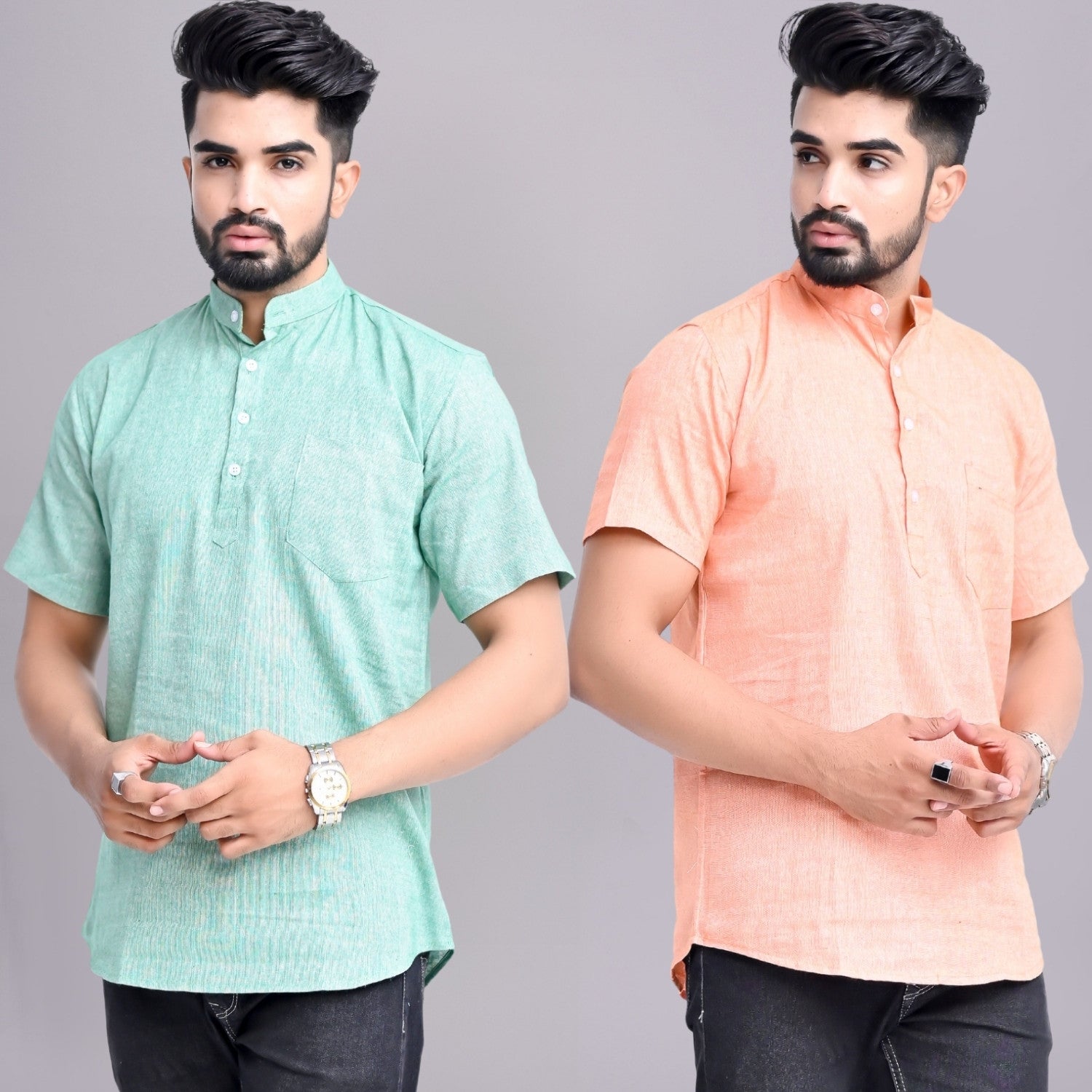 Pack of 2 Mens Solid Green And Orange Khadi Cotton Short Kurta Combo