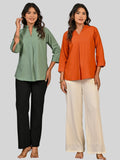 Solid Green And Orange V Neck Viscose Pleated Tops Combo