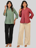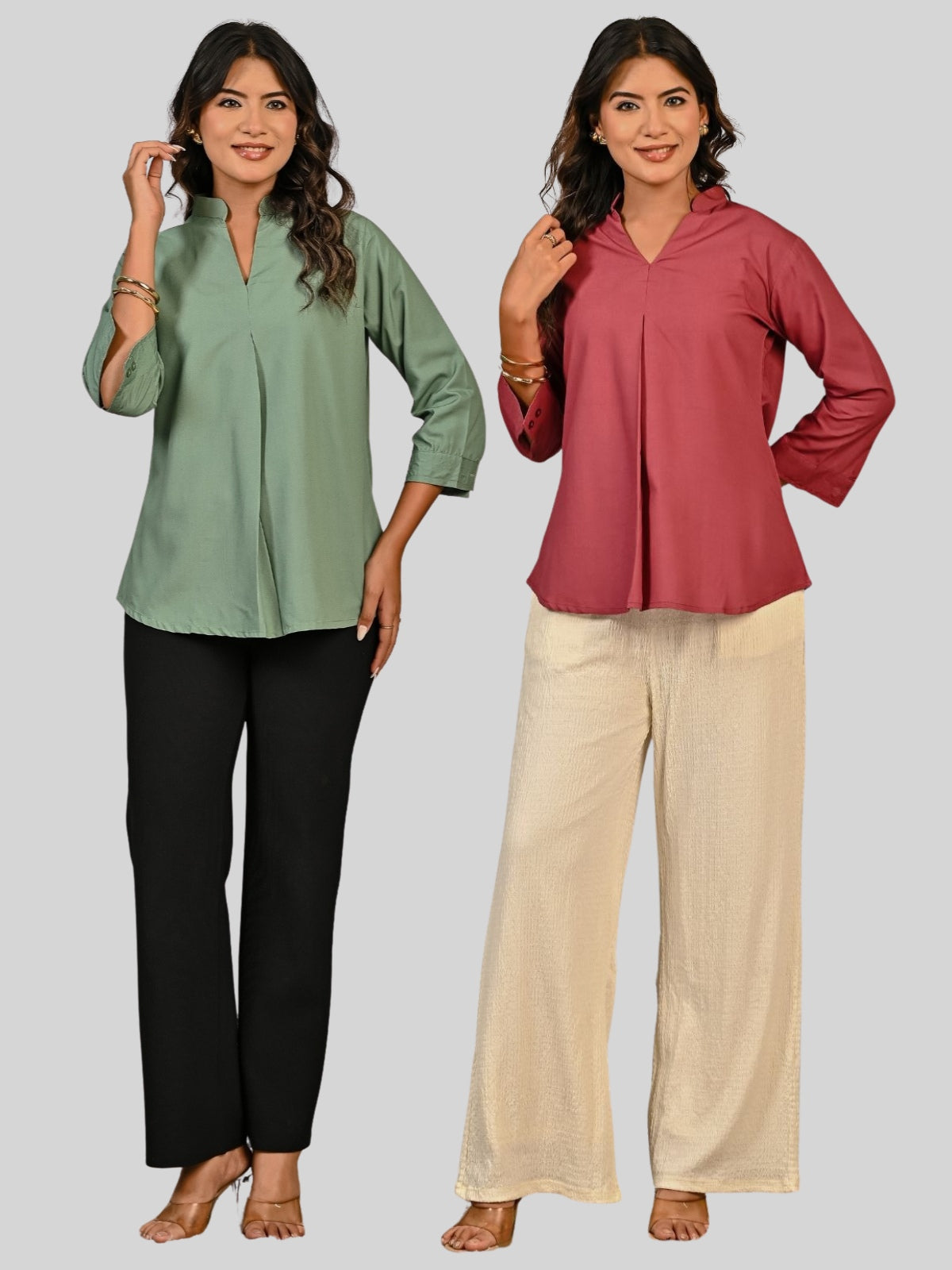 Solid Green And Peach V Neck Viscose Pleated Tops Combo