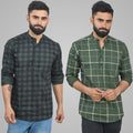 Pack Of 2 Mens Green And Mehendi Green Wide Check Cotton Short Kurta Combo