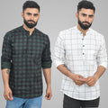 Pack Of 2 Mens Green And White Wide Check Cotton Short Kurta Combo