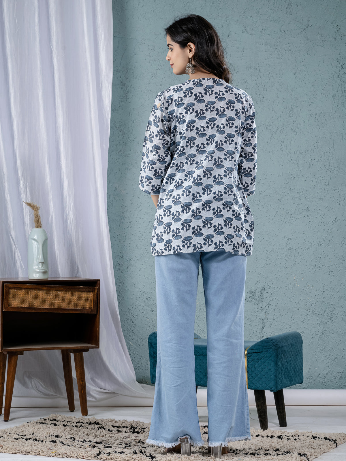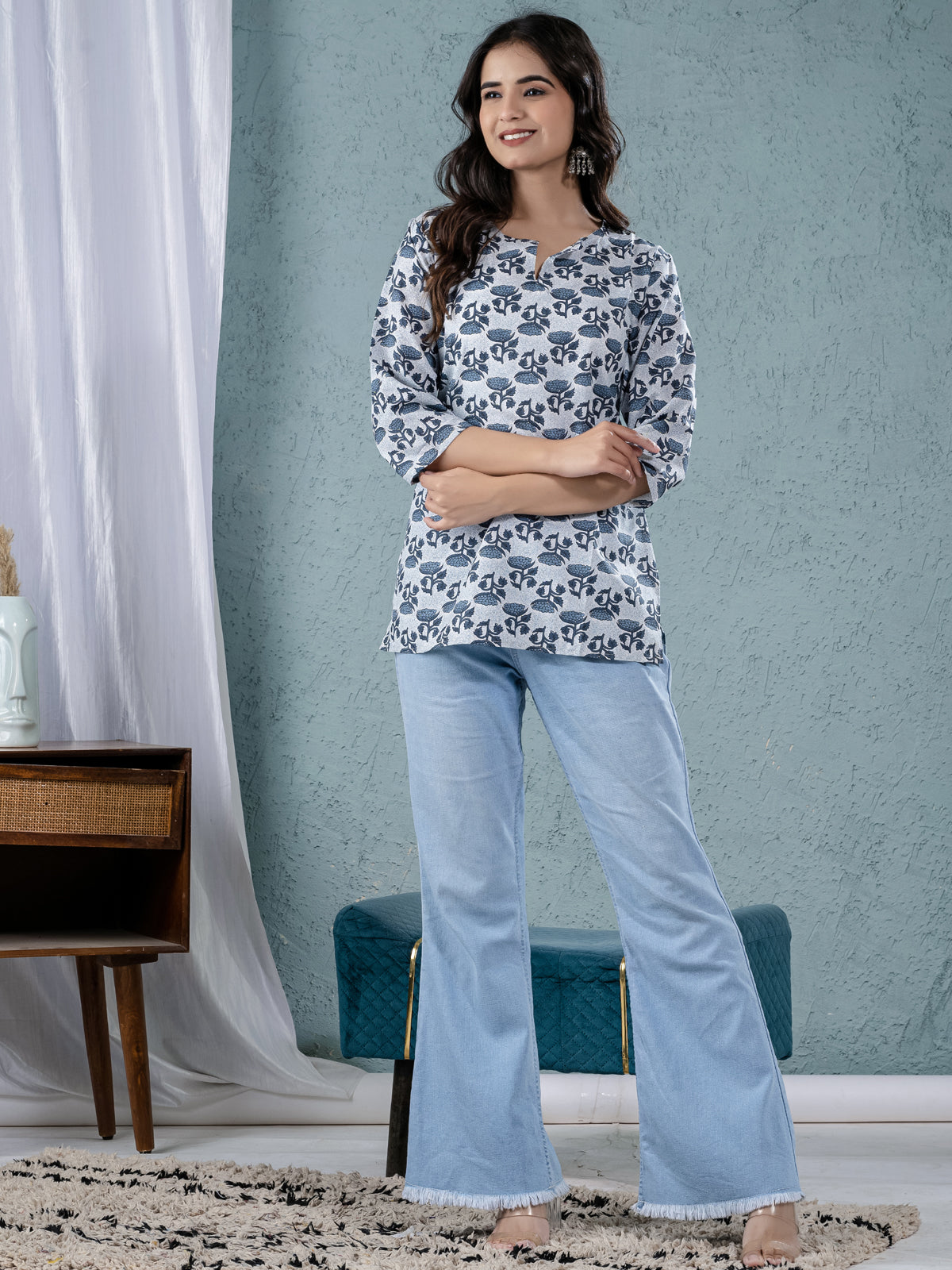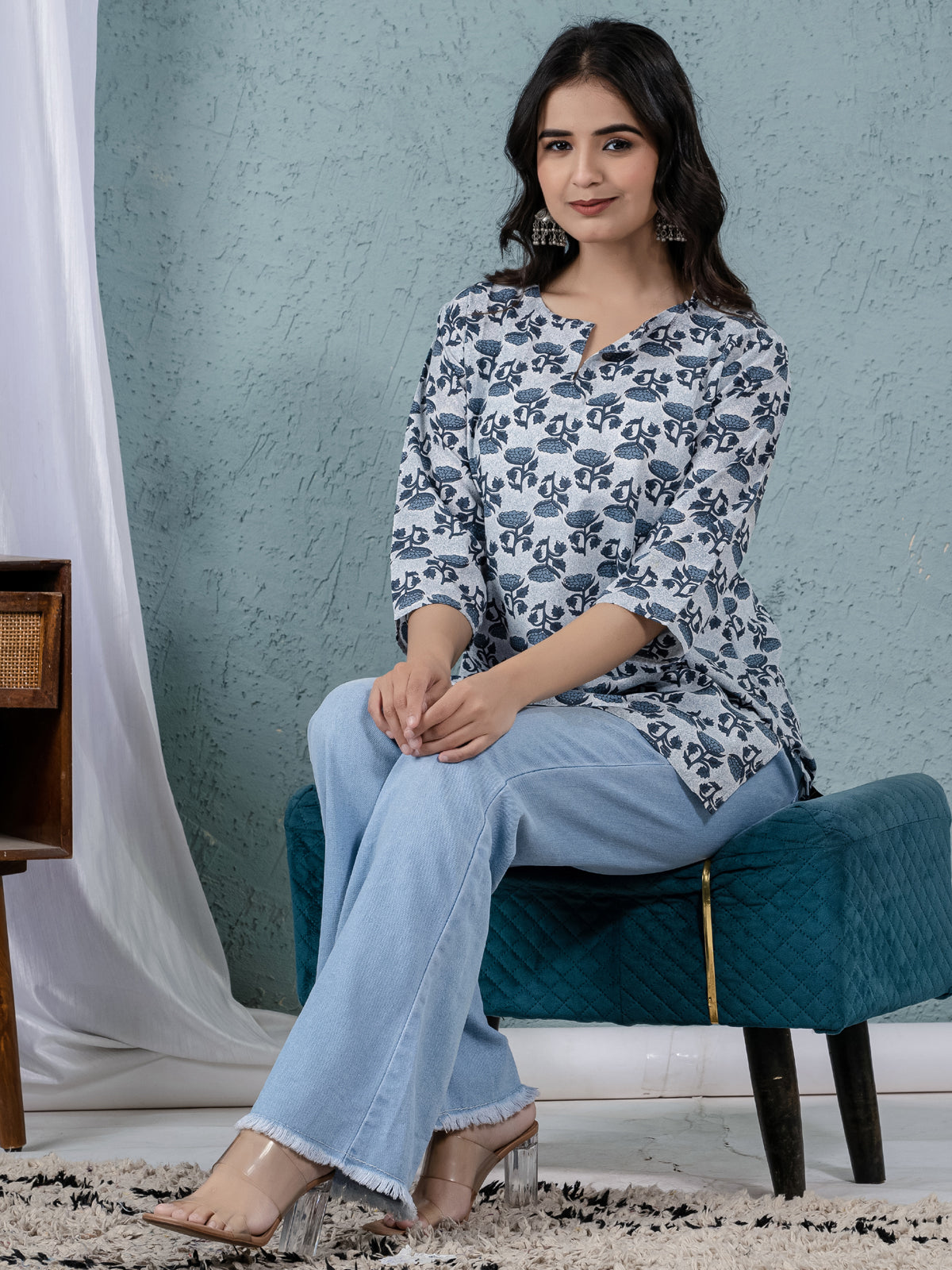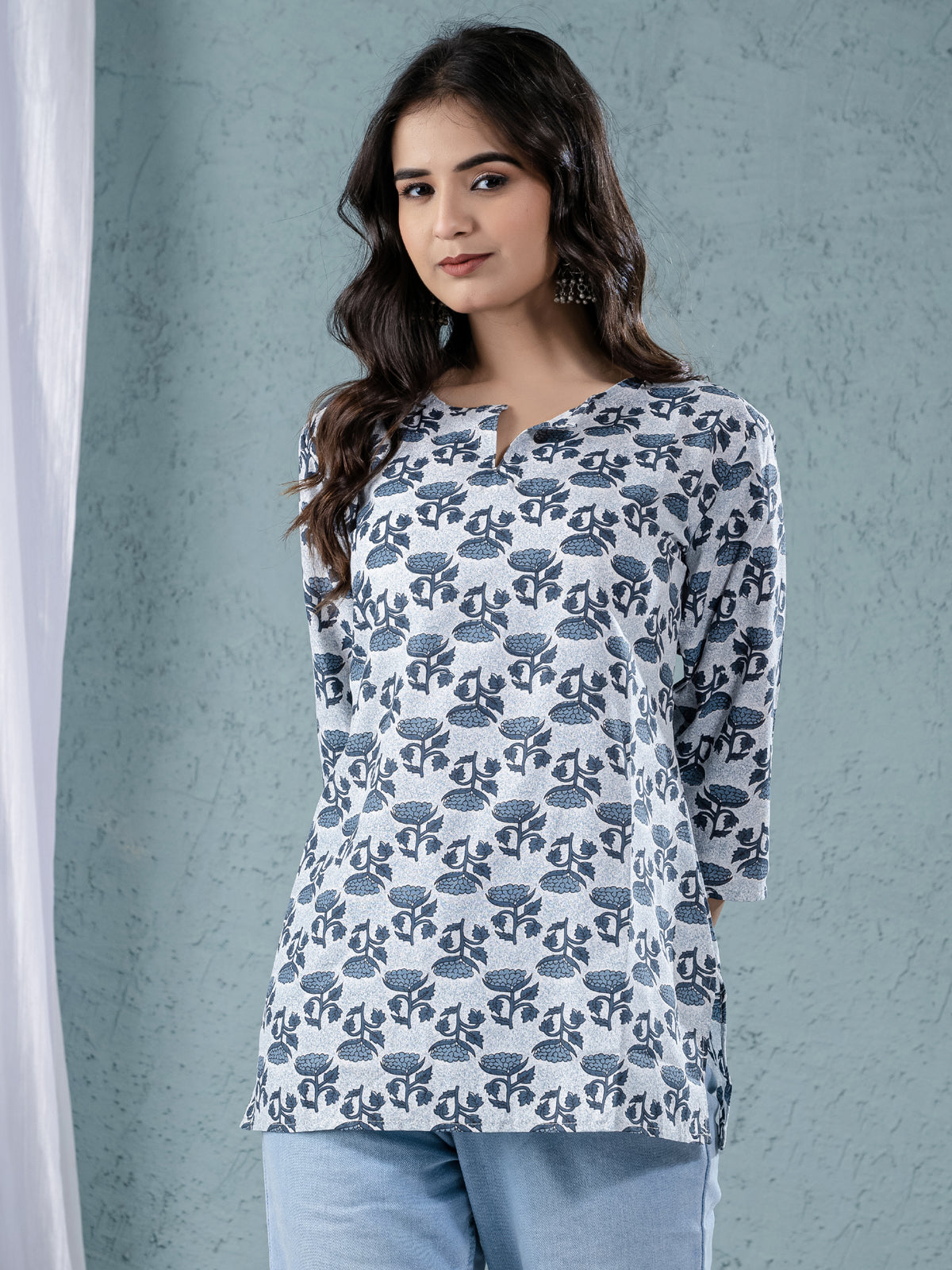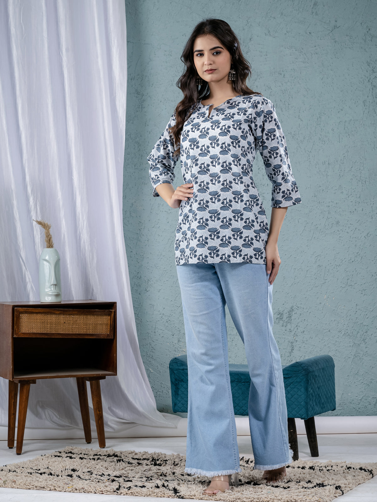 Womens Grey Sanganeri Printed Cotton Short Kurti