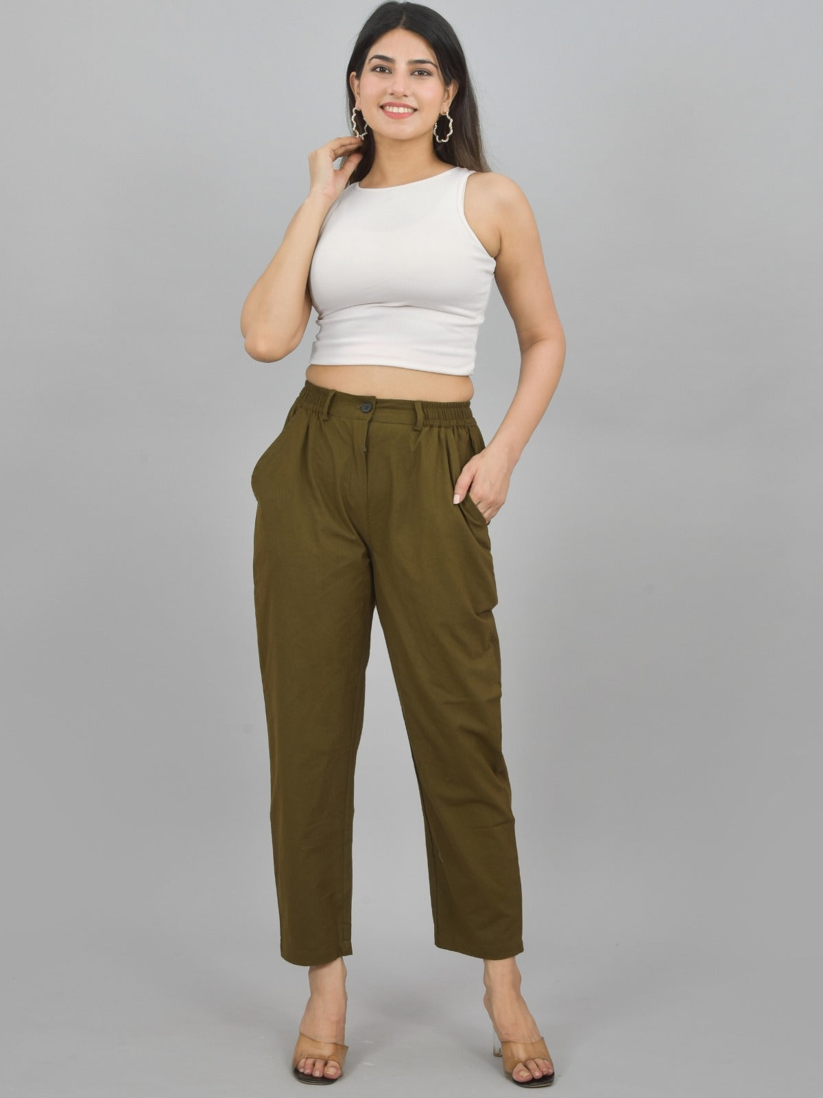 Presenting the pinnacle of comfort and style—Combo Pack of 2 Womens Cotton Formal Pants. The trousers are created of breathable cotton, which keeps you feeling light and comfortable all day. A practical button for closure and an elastic waistband ensure a snug, customizable fit that fits your body type. A elegant chain detail brings a touch of modern flair and skillfully combines style with functionality.These trousers, which are made to be versatile, have two useful slash pockets that improve the overall look and offer useful storage space. In addition to providing outstanding breathability, the cotton material guarantees durability and ease of maintenance. These pants are the ideal mix of comfort and style, whether you're lounging around the house, going out on the town, or heading to the office.