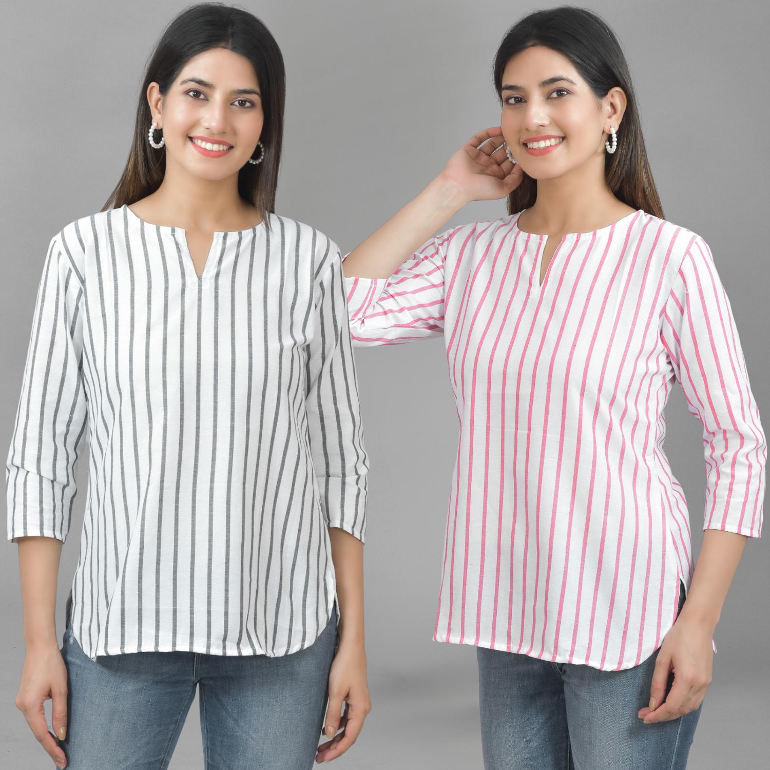 Our Set of Two Striped Cotton Women Tops Combo offers unmatched comfort and style. For stylish ladies who value both cost and quality, these contemporary tops are ideal. These tops, which are made of soft and lightweight cotton, have a timeless striped pattern that elevates any outfit. These tops are adaptable for any occasion with a flattering fit and a robust design. With this essential set, you can up your style ante while maintaining comfort. Get our Striped Cotton Women Tops Combo today to stand out From The Crowd.