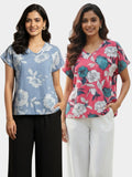 Pack Of 2 Womens Grey And Pink White Airy Linen Cotton Printed Tops