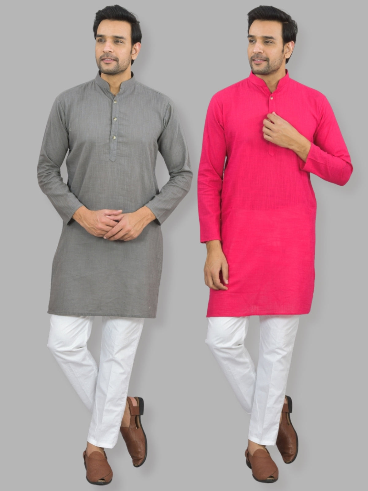 Mens Solid Grey And Rani Cotton Long Kurta Combo