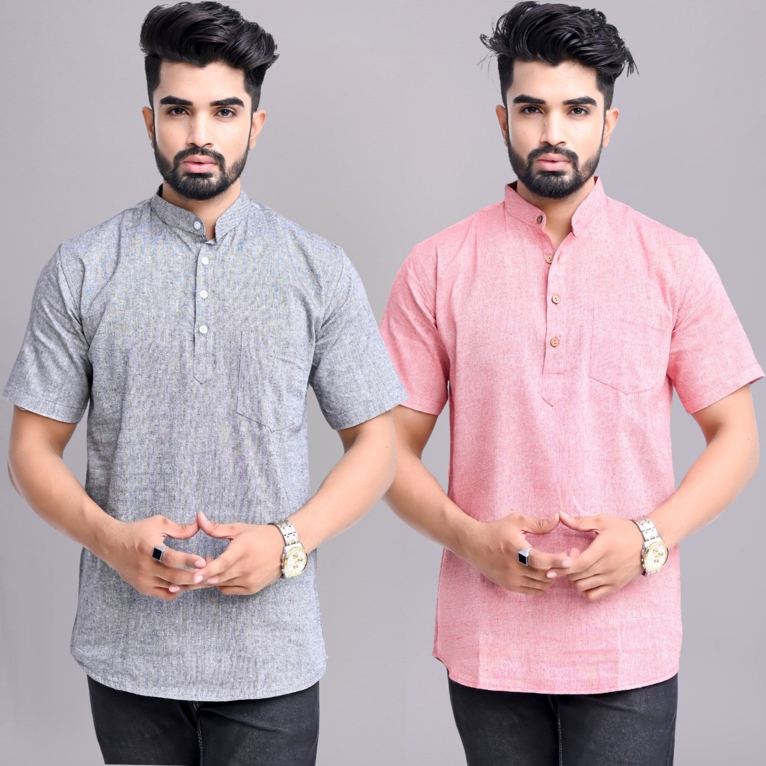 Pack of 2 Mens Solid Grey And Red Khadi Cotton Short Kurta Combo