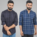 Pack Of 2 Mens Grey And Navy Blue Wide Check Cotton Short Kurta Combo