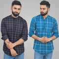 Pack Of 2 Mens Grey And Teal Blue Wide Check Cotton Short Kurta Combo