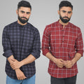 Pack Of 2 Mens Grey And Wine Wide Check Cotton Short Kurta Combo