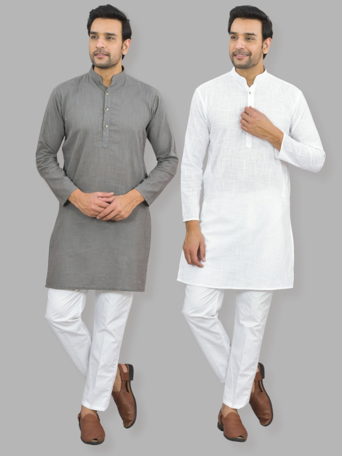 Mens Solid Grey And White Cotton Long Kurta Combo