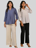 Solid Grey And White V Neck Viscose Pleated Tops Combo