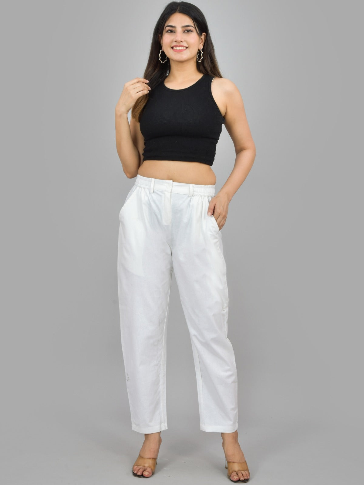 Presenting the pinnacle of comfort and style—Combo Pack of 2 Womens Cotton Formal Pants. The trousers are created of breathable cotton, which keeps you feeling light and comfortable all day. A practical button for closure and an elastic waistband ensure a snug, customizable fit that fits your body type. A elegant chain detail brings a touch of modern flair and skillfully combines style with functionality.These trousers, which are made to be versatile, have two useful slash pockets that improve the overall look and offer useful storage space. In addition to providing outstanding breathability, the cotton material guarantees durability and ease of maintenance. These pants are the ideal mix of comfort and style, whether you're lounging around the house, going out on the town, or heading to the office.