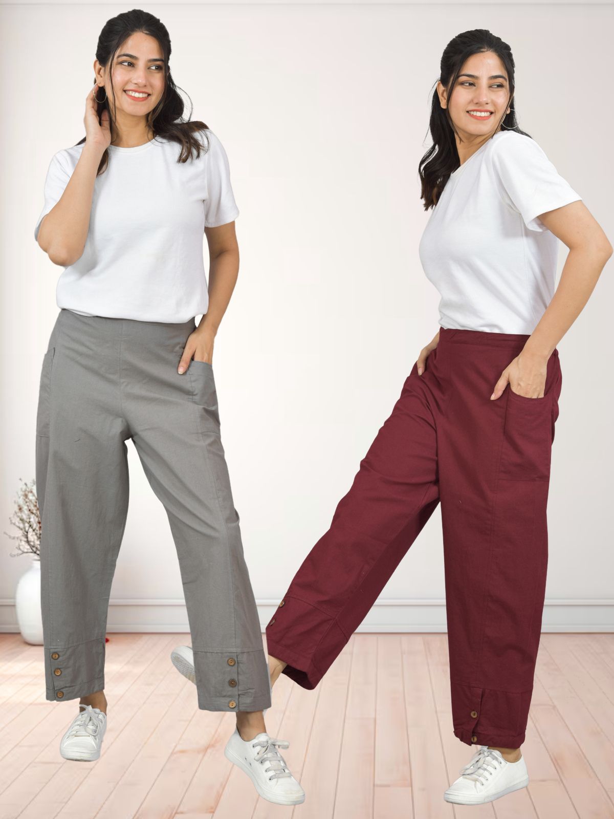 Our Combo Pack of Women's Side Pocket Cotton Straight Cargo Pants will elevate your style and comfort. These trousers offer a timeless straight-leg fit for all body types and are made of high-quality, breathable pure cotton. They're both elegant and useful, with convenient side pockets that make them suitable for everyday wear or outdoor trips. Choose from a variety of fashionable colours and sizes to update your wardrobe with these adaptable cargo pants that seamlessly merge style and functionality.