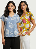 Pack Of 2 Womens Grey And Yellow Airy Linen Cotton Printed Tops