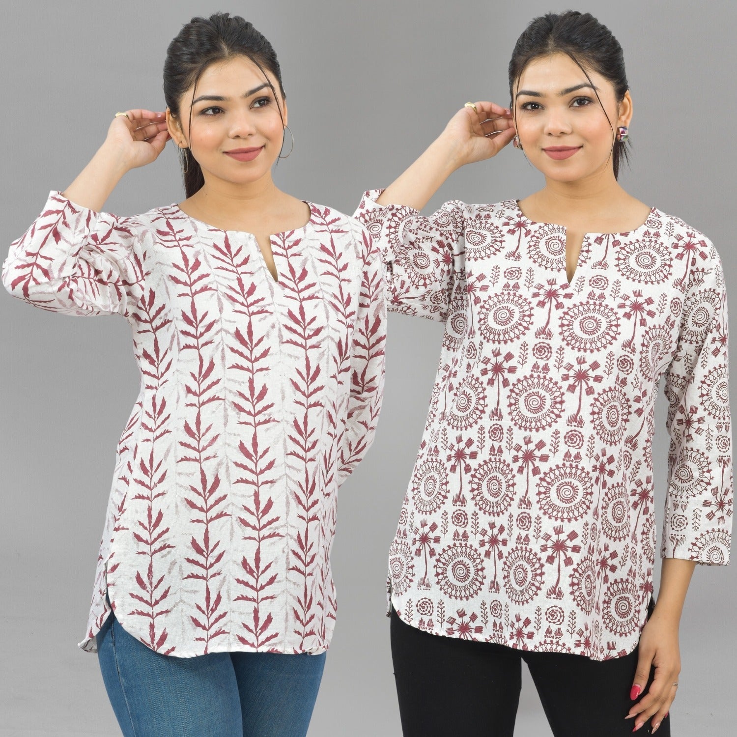 Pack Of 2 Womens Regular Fit Maroon Leaf And Maroon Tribal Printed Tops Combo