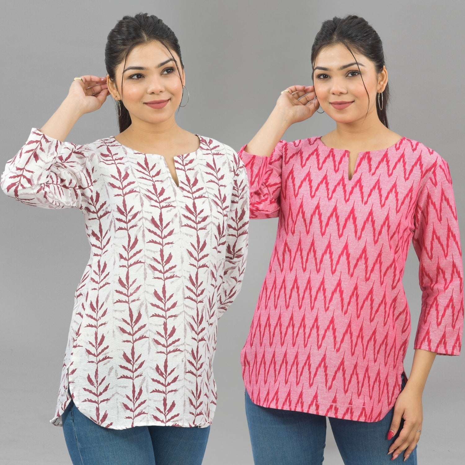 Discover the ideal combination of style and comfort with our Pack Of 2 Womens Regular Fit Short Tops Combo. Embrace the essence of fashion with appealing floral, tribal, vector, and zigzag prints that bring a splash of excitement to your outfit. These tops are made of quality cotton and are breathable and cosy all day. The round neck with a V-cut enhances your neckline, giving you a sleek and modern look. Elevate your fashion quotient easy with these adaptable short kurti tops that move from casual outings to semi formal occasions. Shop now to update your look with the latest fashion trends for women!