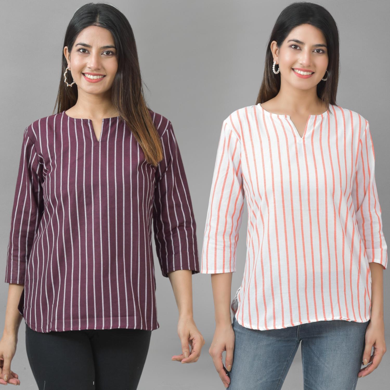 Pack Of 2 Maroon And Orange Striped Cotton Womens Top Combo