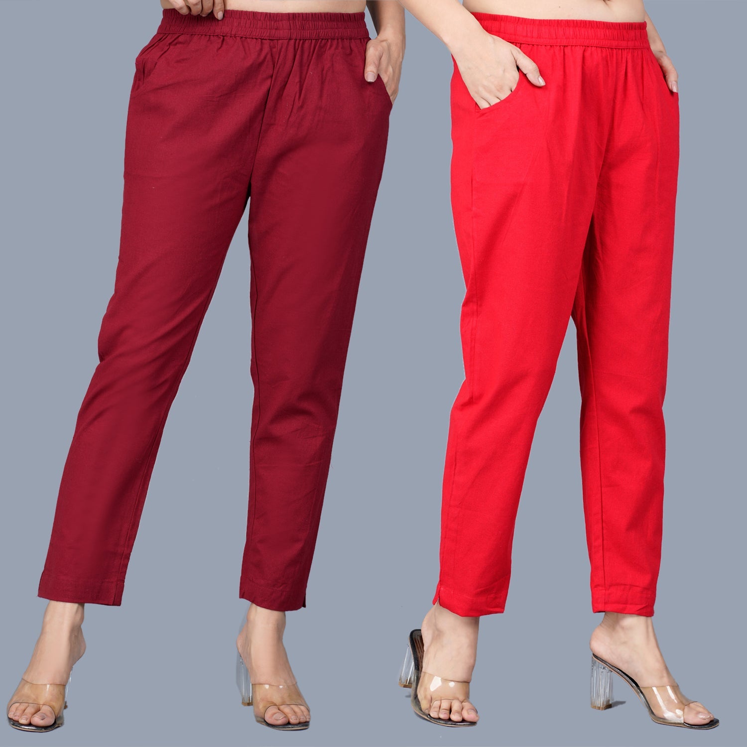 Pack Of 2 Womens Regular Fit Maroon And Red Green Fully Elastic Waistband Cotton Trouser