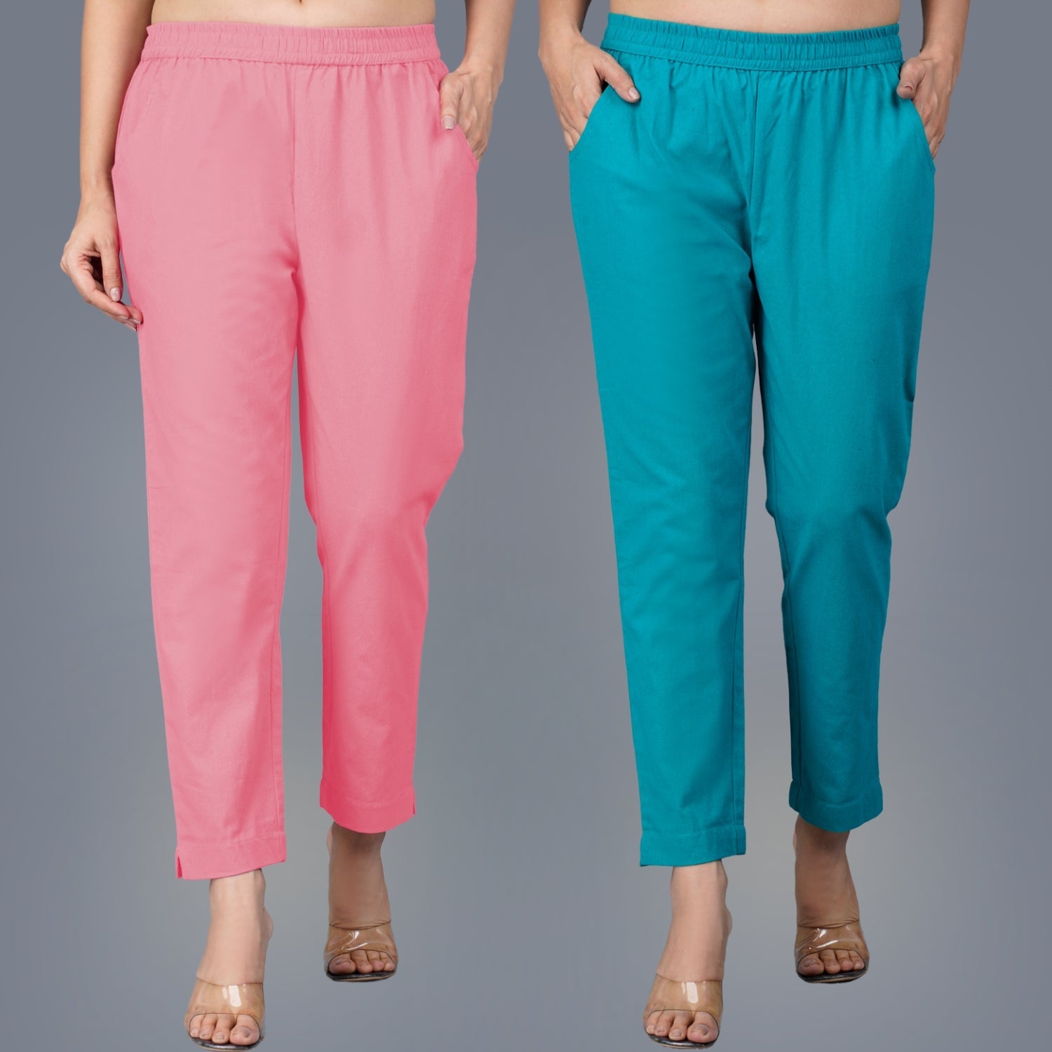 Pack Of 2 Womens Regular Fit Mauve Pink And Cyan Fully Elastic Waistband Cotton Trouser