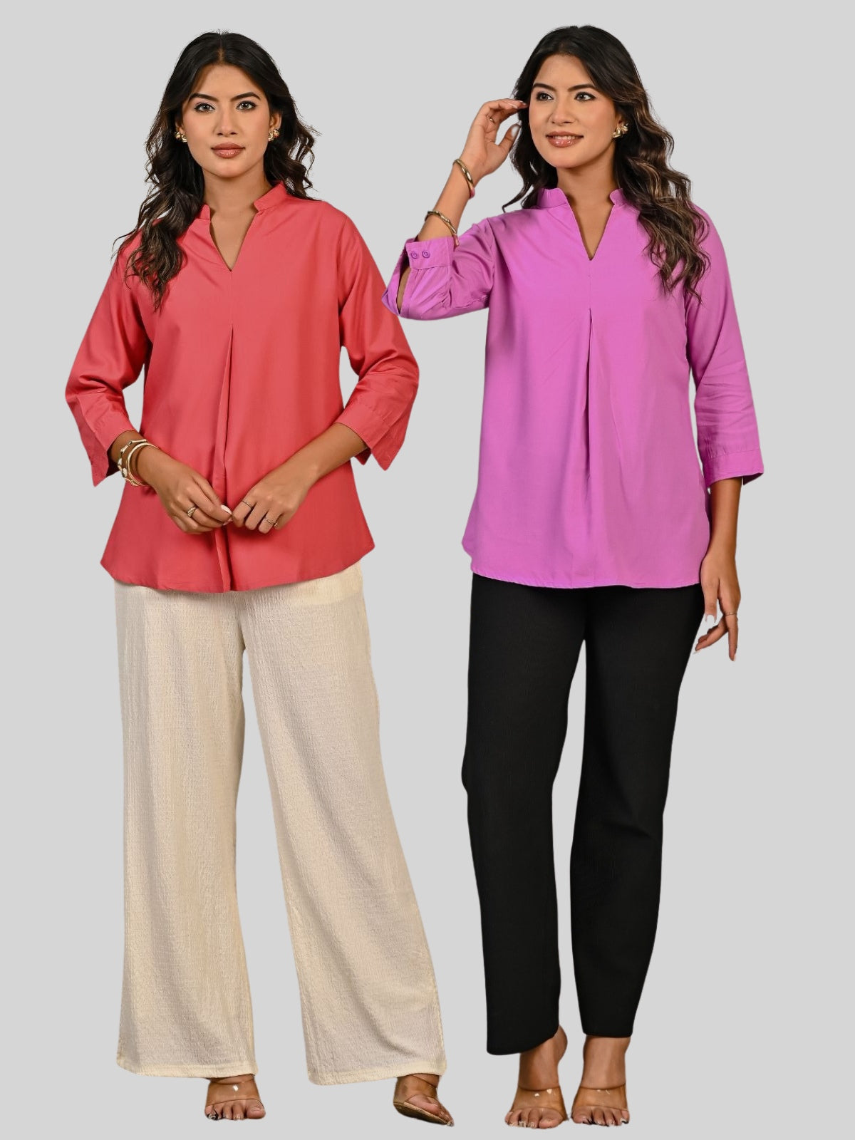 Solid Mauve Pink And Purple V Neck Viscose Pleated Tops Combo