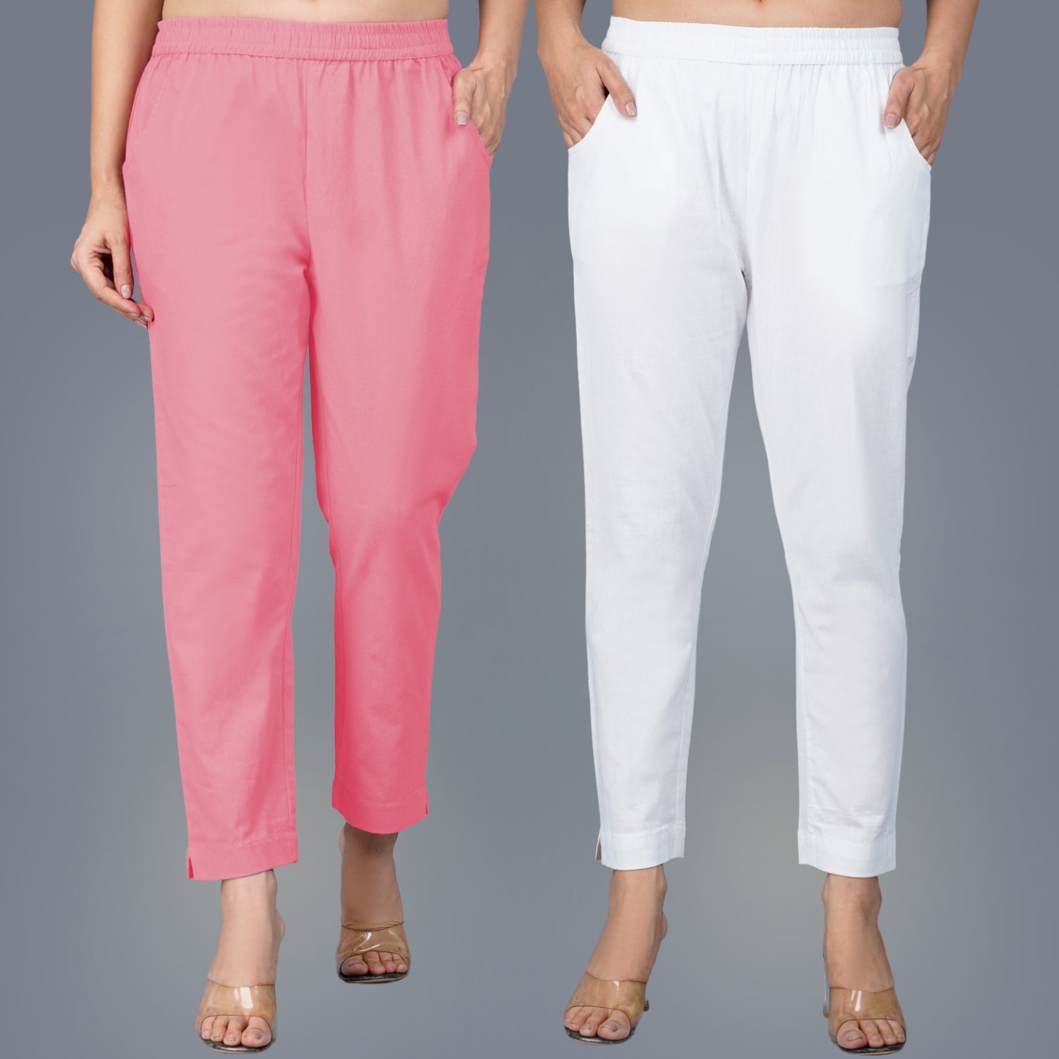 Pack Of 2 Womens Regular Fit Mauve Pink And White Fully Elastic Waistband Cotton Trouser