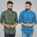 Pack Of 2 Mens Mehendi Green And Teal Blue Wide Check Cotton Short Kurta Combo