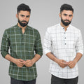 Pack Of 2 Mens Mehendi Green And White Wide Check Cotton Short Kurta Combo