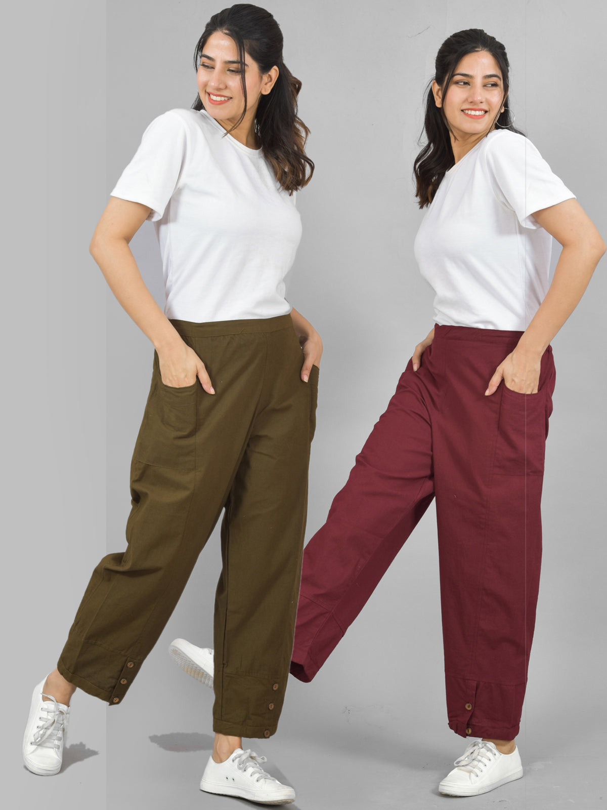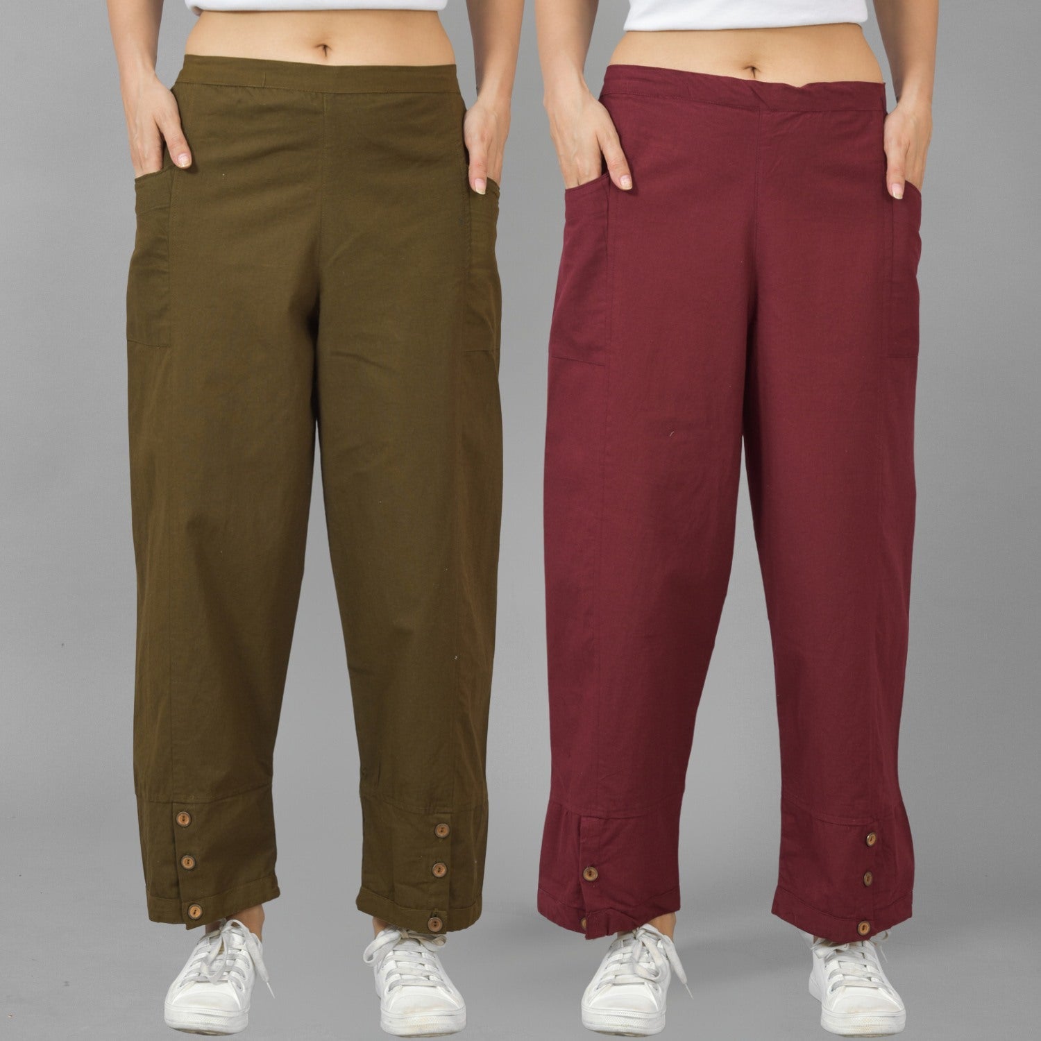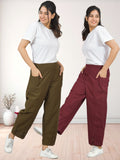Combo Pack Of Womens Mehndi Green And Wine Side Pocket Straight Cargo Pants