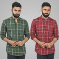 Pack Of 2 Mens Mehendi Green And Wine Wide Check Cotton Short Kurta Combo