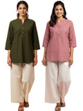 This Pack Of 2 Women's Solid Top Combo, is the ideal fusion of comfort and design, These will upgrade your wardrobe, made from a high-quality cotton that keeps you comfortable all day. Your outfit is made more sophisticated by the tasteful design. These adaptable tops is the perfect pick whether you're going to the office, on a casual trip, or to a weekend brunch. It radiates classic appeal and ups your fashion game, complete with a chinese/mandarin collar. The Women's Solid Top Combo can help you achieve modern elegance right away.