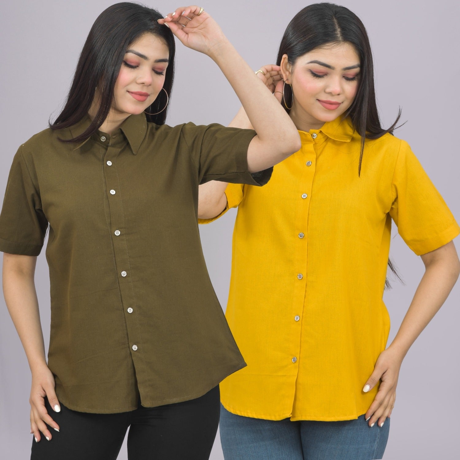 Pack Of 2 Womens Solid Mehendi And Mustard Half Sleeve Cotton Shirts Combo