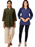 Pack Of 2 Womens Regular Fit Mehendi Green And Navy Blue Three Fourth Sleeve Cotton Tops Combo