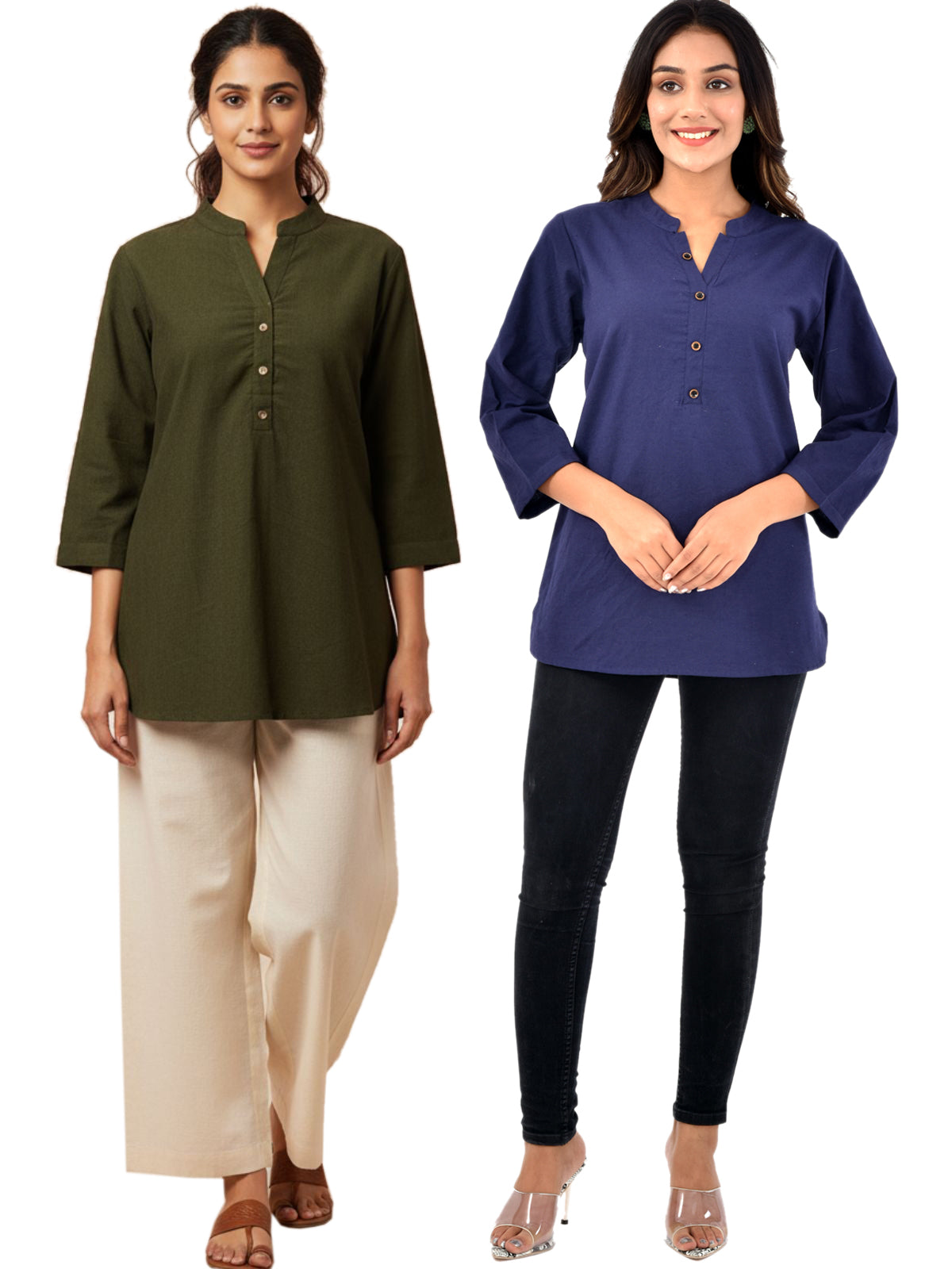 This Pack Of 2 Women's Solid Top Combo, is the ideal fusion of comfort and design, These will upgrade your wardrobe, made from a high-quality cotton that keeps you comfortable all day. Your outfit is made more sophisticated by the tasteful design. These adaptable tops is the perfect pick whether you're going to the office, on a casual trip, or to a weekend brunch. It radiates classic appeal and ups your fashion game, complete with a chinese/mandarin collar. The Women's Solid Top Combo can help you achieve modern elegance right away.