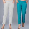 Pack Of 2 Womens Regular Fit Melange Grey And Cyan Fully Elastic Waistband Cotton Trouser