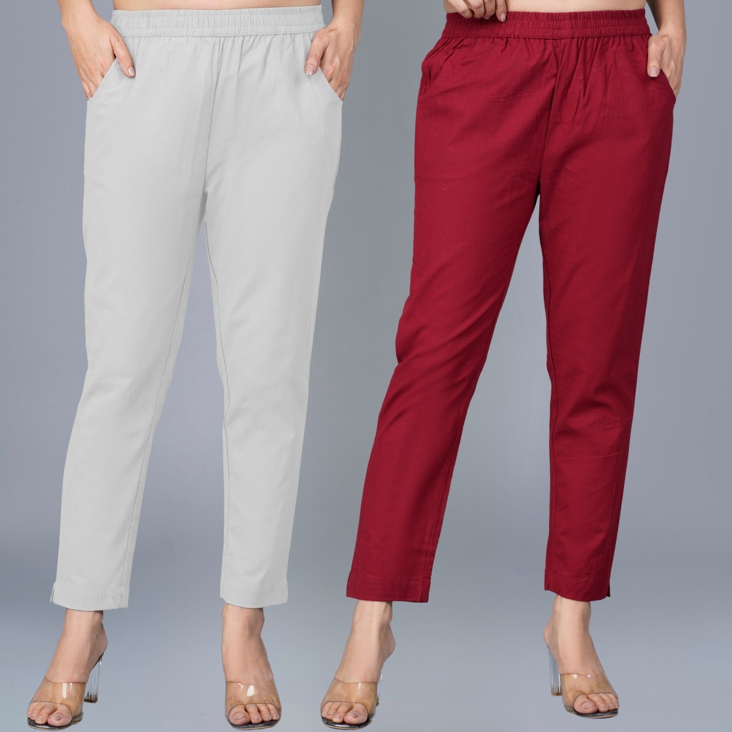Pack Of 2 Womens Regular Fit Melange Grey And Maroon Fully Elastic Waistband Cotton Trouser