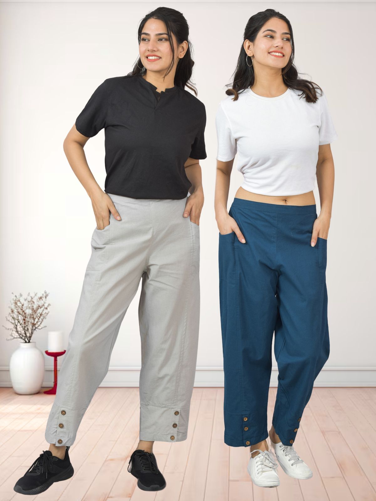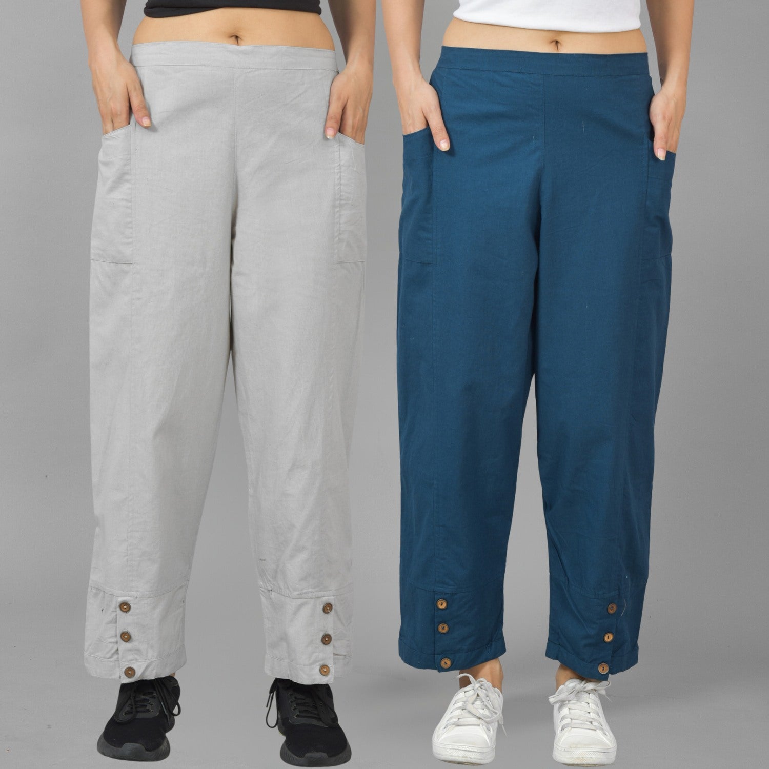 Combo Pack Of Womens Melange Grey And Teal Blue Side Pocket Straight Cargo Pants