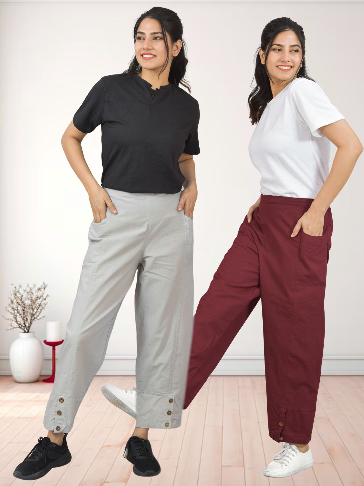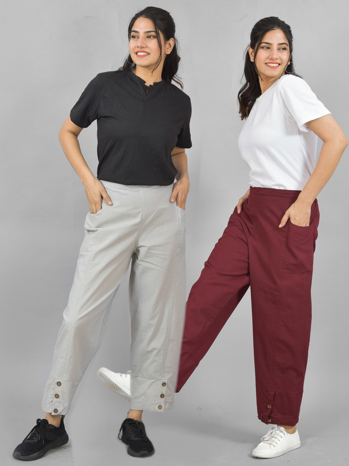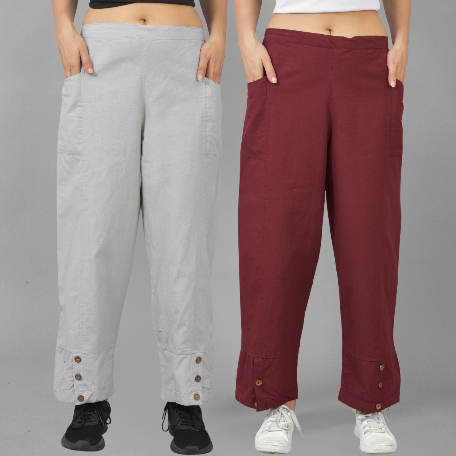 Combo Pack Of Womens Melange Grey And Wine Side Pocket Straight Cargo Pants